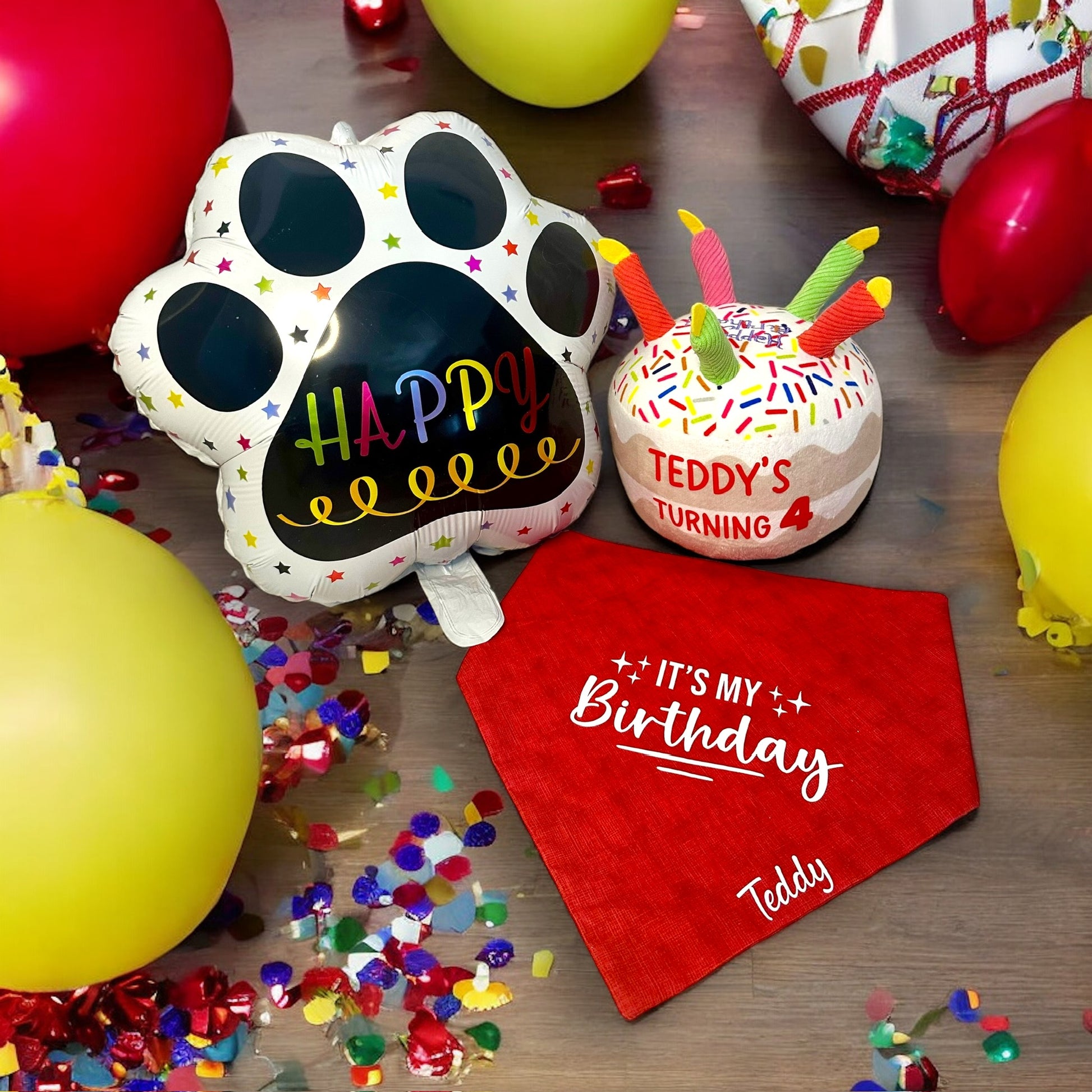 Celebrate your furry friend's first birthday in style with our pawsonalized "It's My 1st Birthday" dog bandana set. This charming package includes a festive bandana, a fun 'Birthday Cake' toy, and a paw-shaped balloon, making it the perfect ensemble for your pup's big day. Crafted from durable materials, these accessories are designed to keep up with your dog's birthday activities. Whether hosting a lively puppy bash or a cozy family gathering, your little one will look adorably celebratory in this colorful set.